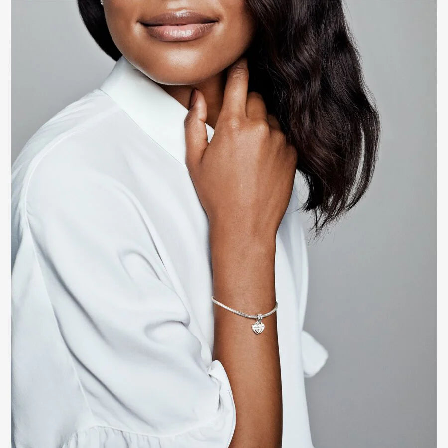 Sterling silver split-heart charm with “Mother” and “Daughter” engravings, featuring a soft pink enamel heart, celebrating a special unbreakable bond.