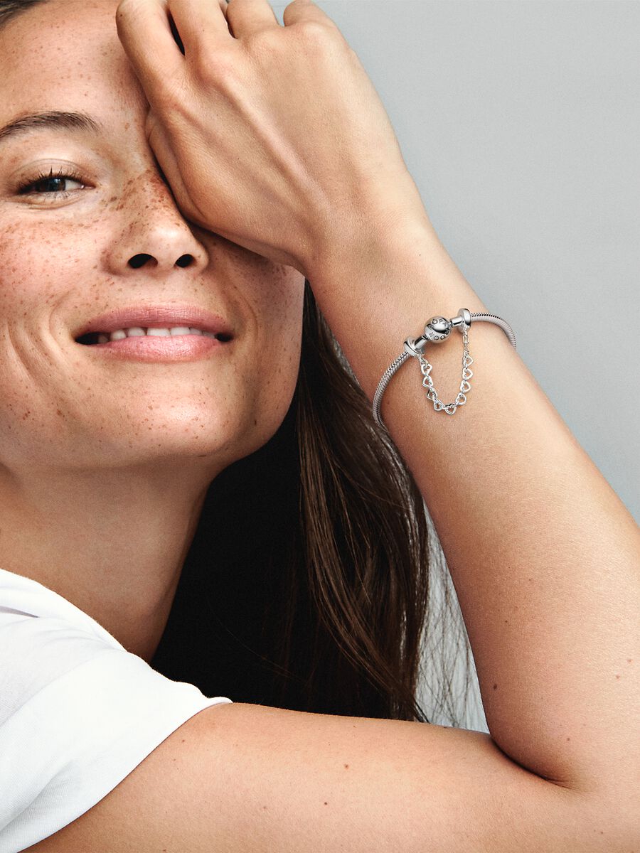 Elegant sterling silver safety chain featuring interlinked heart-shaped links, designed to keep your bracelet secure while adding a touch of timeless love-inspired detail.