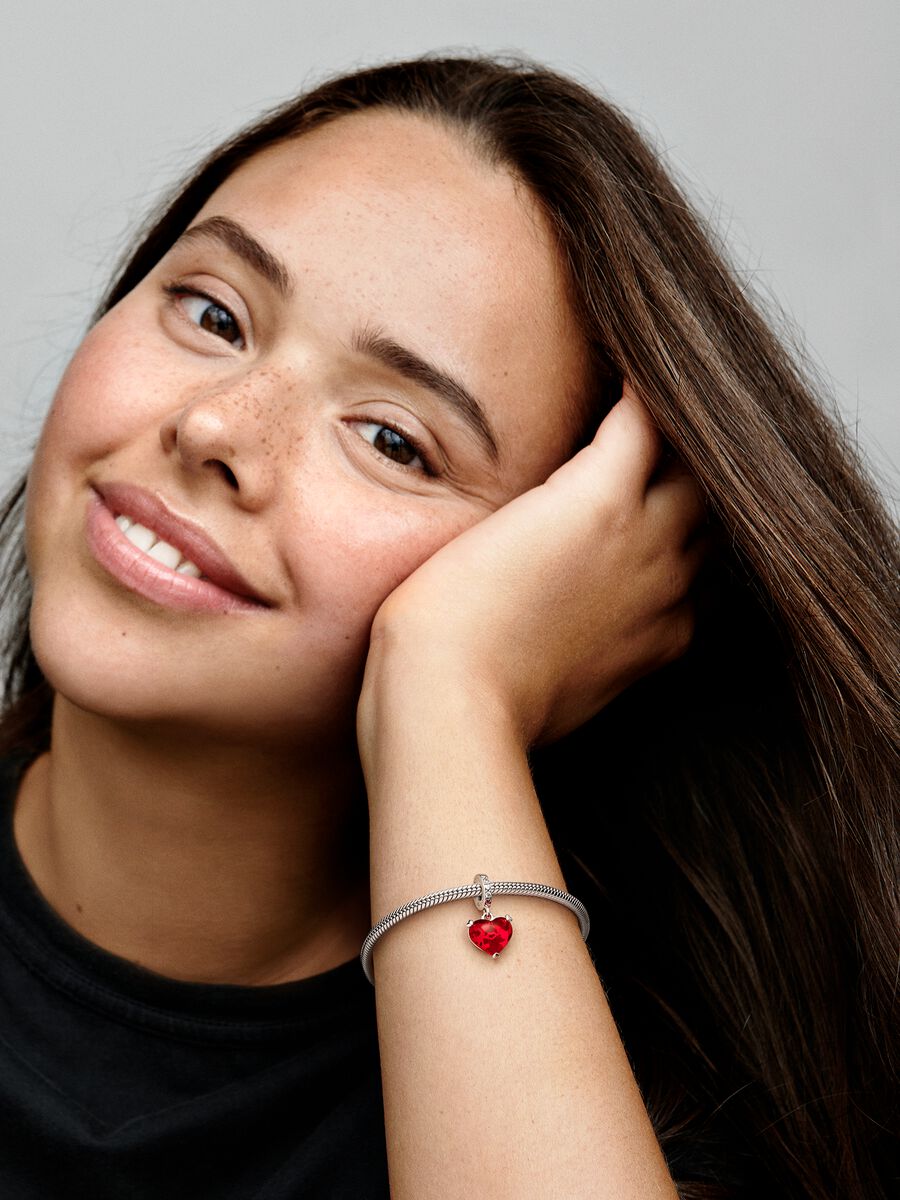 Striking red Murano glass heart charm with sterling silver claw setting and a pavé-accented bail featuring delicate Mickey head silhouettes.